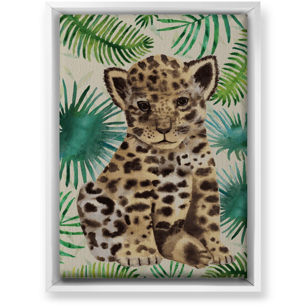 A gold and brown baby leopard portrait on a sustainably sourced canvas with gallery-wrapped edges and easy hanging.