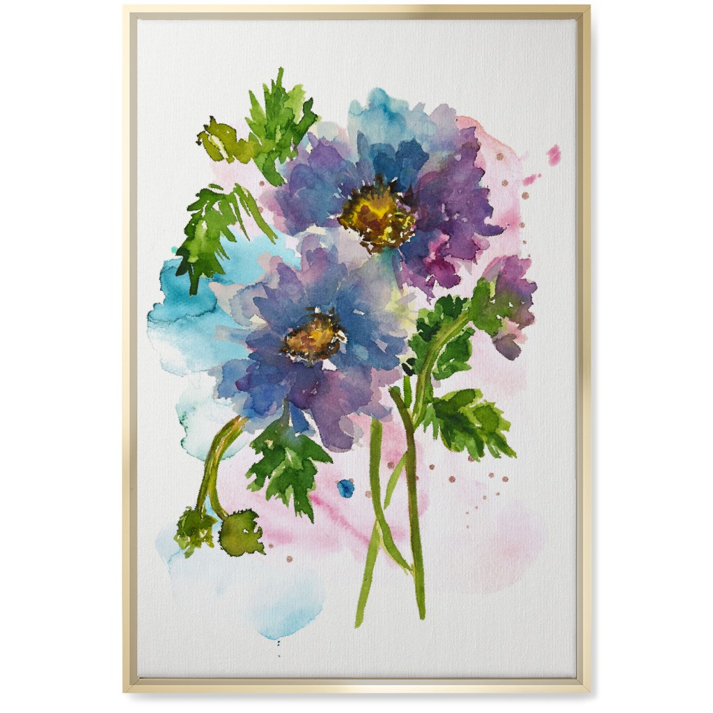 A gold-framed canvas wall art with vivid blue color and gallery-wrapped edges, ready to hang.