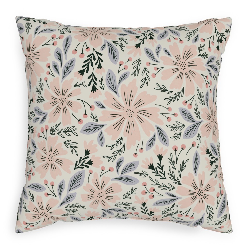 A 16x16 woven pillow with pink pinecones and berries design on a white background, double-sided and machine washable.