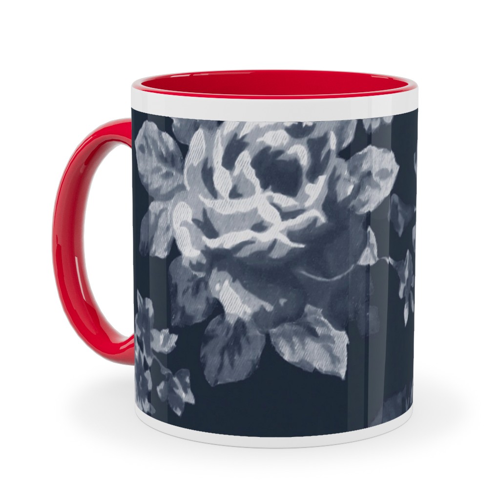 A Navy floral ceramic mug with red accents, available in 11 oz. and 15 oz. sizes.