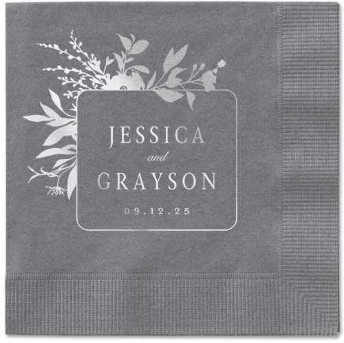 A set of 50 recycled paper napkins in grey with foil-stamped design options in various colors.