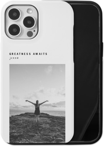 A slim, matte white iPhone case that fits the iPhone 13 Pro Max and is personalized in the USA.