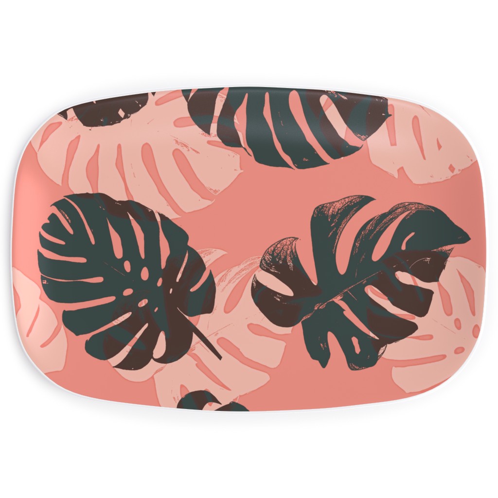 A pink Monstera Leaves serving platter made of scratch-resistant melamine, dishwasher safe and non-toxic.