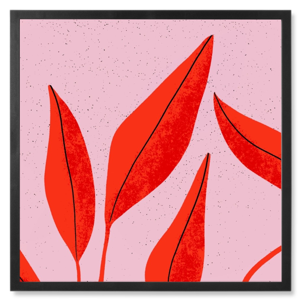 A vibrant red and pink floral photo tile with a black frame, ready to hang with no nails required.