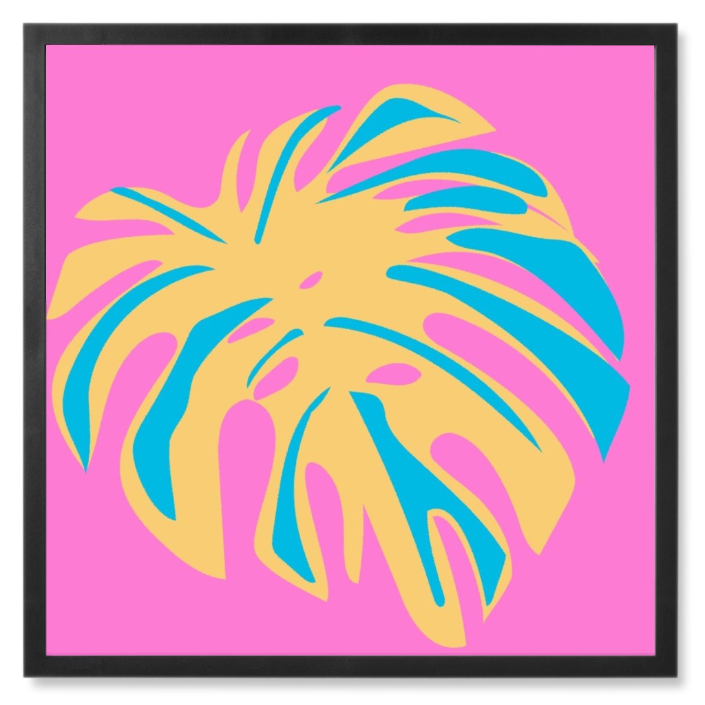 A vibrant pink and yellow tropical leaf photo tile with a black frame, ready to hang.