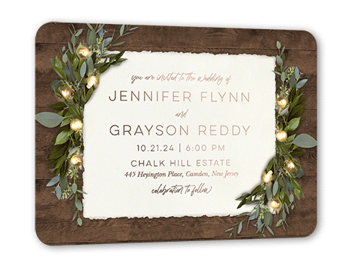 A beige 5x7 wedding invitation with rose gold foil accents, personalized on premium foil cardstock.