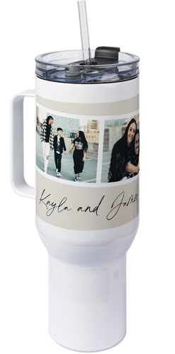 A beige 40oz tumbler with handle featuring a filmstrip collage design, double-wall insulation, and secure lid.