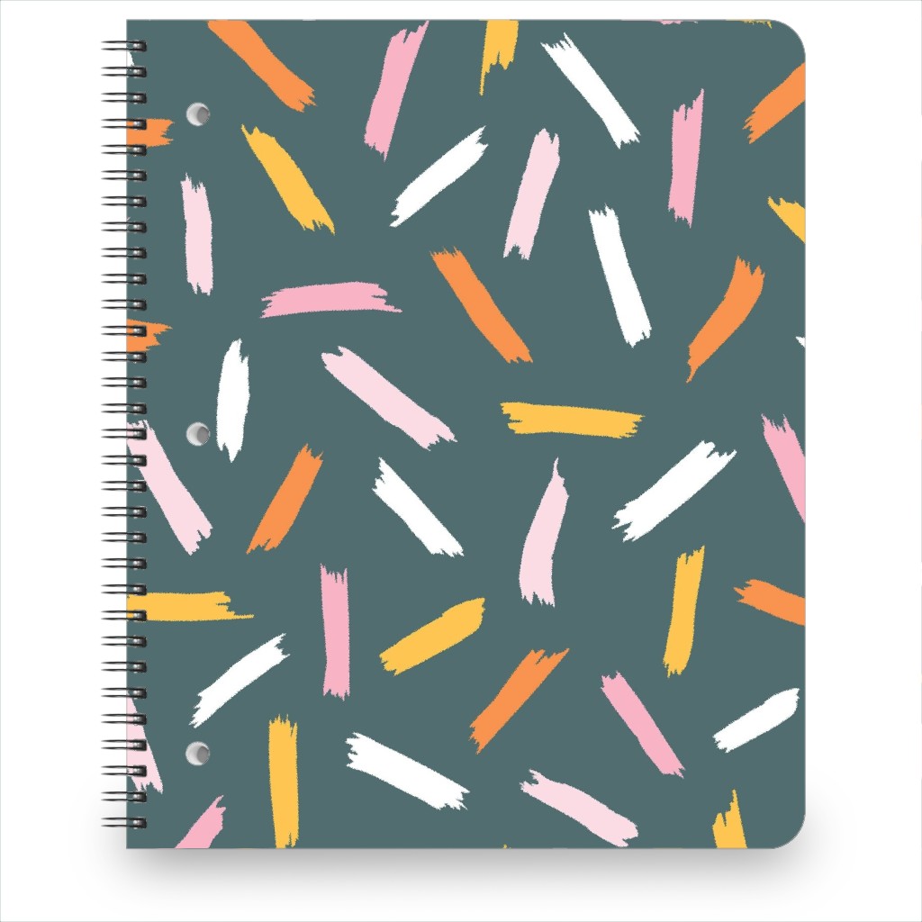 A college-ruled notebook with a peach paint dab design, two pockets, and perforated pages.