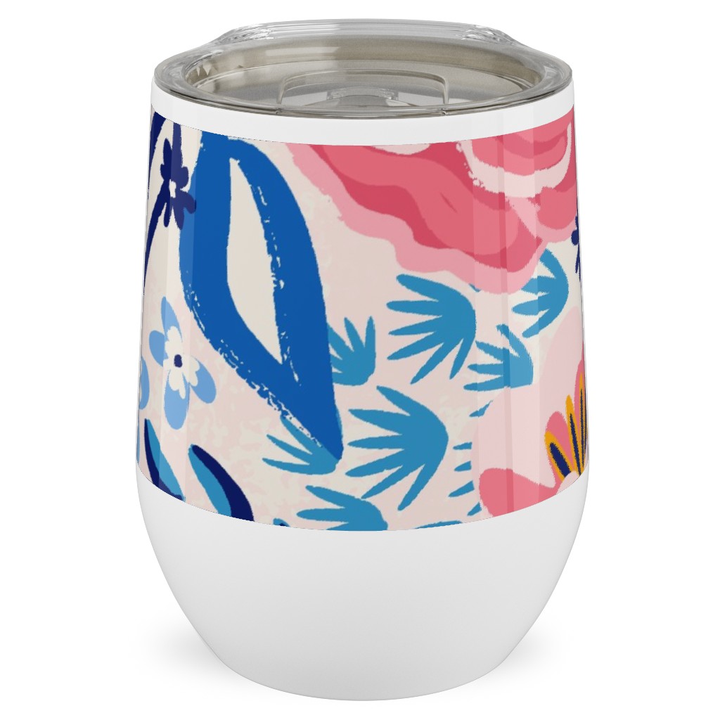 A pink 12oz stainless steel travel tumbler with a watercolor tropical design, personalized in the USA.