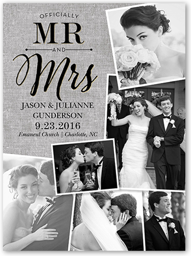 A grey wedding announcement featuring a favorite photo and celebration details, printed on signature smooth cardstock.