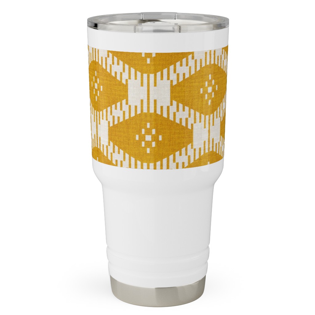 A 30oz orange travel tumbler with a chevron design, stainless steel construction, and BPA-free plastic lid.