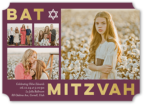 Mazel Tov! Celebrate your daughter's Bat Mitzvah with a personalized Bat Mitzvah invitation. Just add her photos and event details.