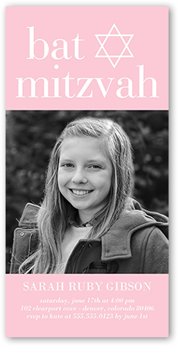 Mazel Tov! Celebrate your daughter's Bat Mitzvah with a personalized Bat Mitzvah invitation. Just add her photos and event details.