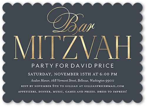 Mazel Tov! Celebrate your son's Bar Mitzvah with a personalized Bar Mitzvah invitation. Just add his photos and event details.