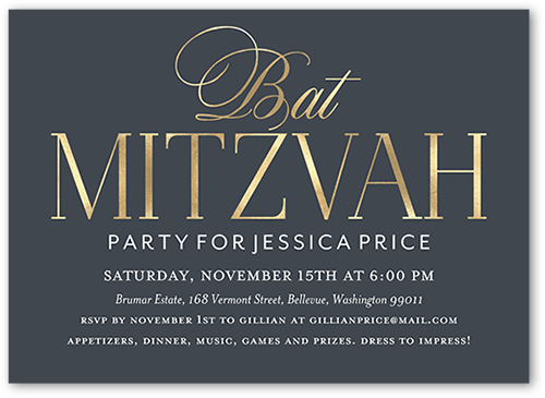 Mazel Tov! Celebrate your daughter's Bat Mitzvah with a personalized Bat Mitzvah invitation. Just add her photos and event details.