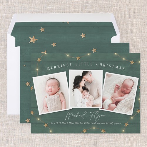 Celebrate your baby’s first Christmas with this rustic birth announcement holiday card. This classic Christmas card features the message “merriest little christmas” with twinkling gold stars framing the background, setting a cheerful scene for your family’s holiday announcement. Choose from a brown, green, or red background in a natural wood-grain texture to match your style and photos. With space for three to six photos, this multi photo birth announcement Christmas card lets you showcase sweet moments from your baby’s first year. Personalize the card with your baby’s name and birth details, making it a keepsake friends and family will treasure. This 6x8 card has plenty of room to add more photos or a heartfelt message on the back to share even more memories.