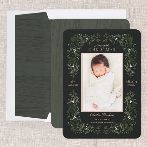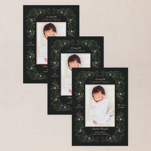 Celebrate your little one’s arrival with this artistic holiday card, perfect for sharing your baby’s first Christmas. The botanical design features a delicate frame of watercolored greenery and berries, creating a soft, welcoming border around your favorite newborn photo. This birth announcement Christmas card lets you add all the important details—name, birth date, and stats—so friends and family can share in your joy. Choose between a sleek black or crisp white background to best complement your photo and style. Personalize your greeting and family name in real foil, available in gold foil, rose gold foil, or iridescent foil, for a touch of shimmer that makes your Christmas card extra special. This 5x7 Christmas birth announcement card is a keepsake your loved ones will treasure.