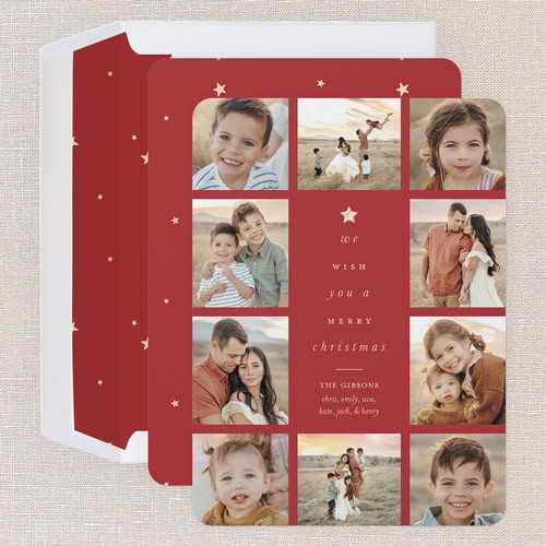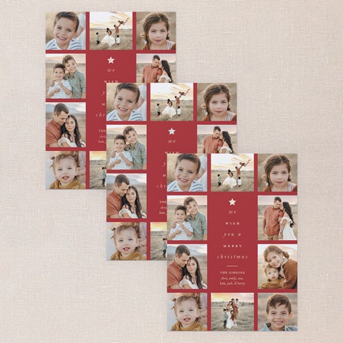 Share all your favorite moments with this classic, multi photo Christmas card. The design features elegant typography with the greeting “We wish you a Merry Christmas,” or personalize it to match your style. For an extra special touch, print your family name and personalized greeting in real foil, available in gold foil, rose gold foil, or iridescent foil. The beautiful collage layout has space for up to 10 photos to let your memories shine. Pick from a deep green, festive red, and clean white background color, or click the color wheel icon to choose your own background color, great for coordinating with the colors in your photos. Add more photos or a heartfelt message on the back for free on this 6x8-sized card.