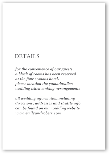 Make your wedding invitations even more personal with enclosure cards, designed to match your wedding invitations, and customized with the details of your big day.