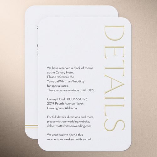 Make your wedding invitations even more personal with enclosure cards, designed to match your wedding invitations, and customized with the details of your big day.