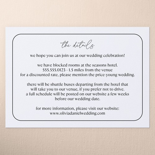 Make your wedding invitations even more personal with enclosure cards, designed to match your wedding invitations, and customized with the details of your big day.