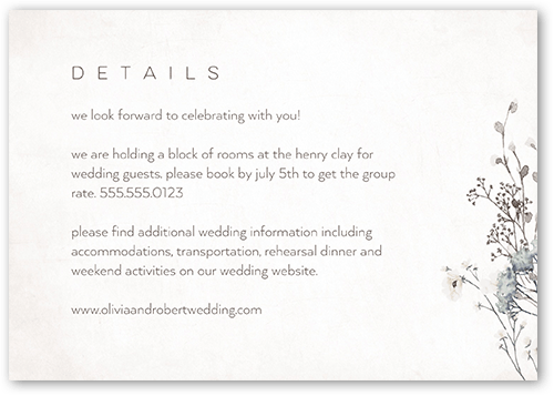 Make your wedding invitations even more personal with enclosure cards, designed to match your wedding invitations, and customized with the details of your big day.
