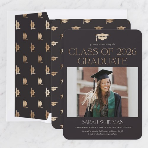 Celebrate the new graduate with this unique graduation announcement. Personalize with the graduate's name and the event details.