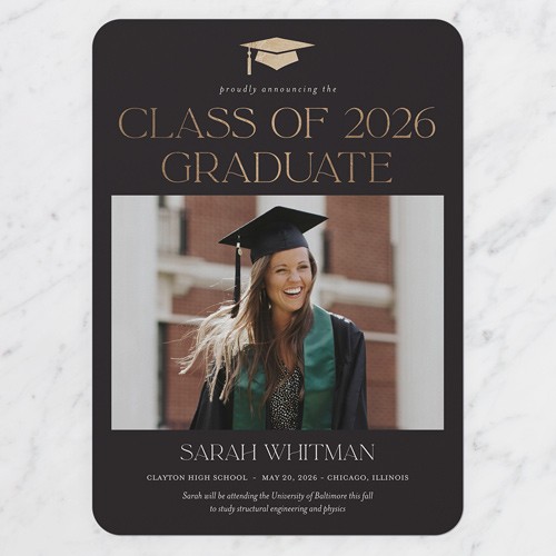 Celebrate the new graduate with this unique graduation announcement. Personalize with the graduate's name and the event details.