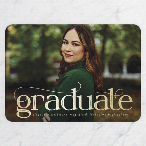 Celebrate the new graduate with this unique graduation announcement. Personalize with the graduate's name and the event details.