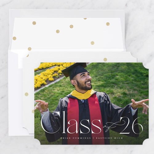 Celebrate the new graduate with this unique graduation announcement. Personalize with the graduate's name and the event details.