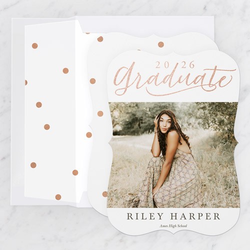 Celebrate the new graduate with this unique graduation announcement. Personalize with the graduate's name and the event details.