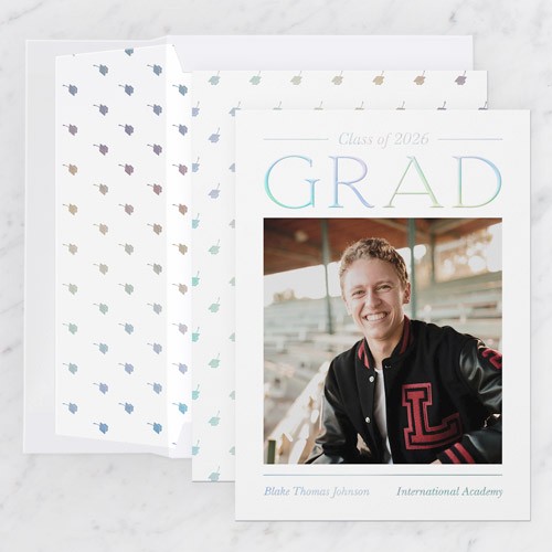 Celebrate the new graduate with this unique graduation announcement. Personalize with the graduate's name and the event details.