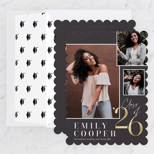 Celebrate the new graduate with a unique graduation announcement. Personalize with the graduate's name, event details, and custom colors. Add 1-4 photos on the front, with the back allowing up to 3 photos for a truly personalized touch. Perfect for commemorating this special achievement!