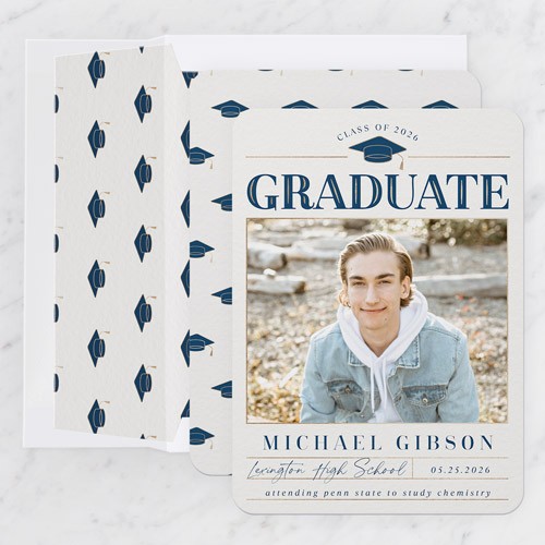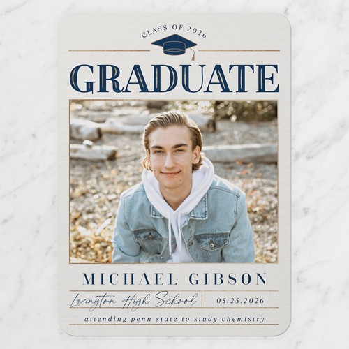 Celebrate the new graduate with this unique graduation announcement. Personalize with the graduate's name and the event details.