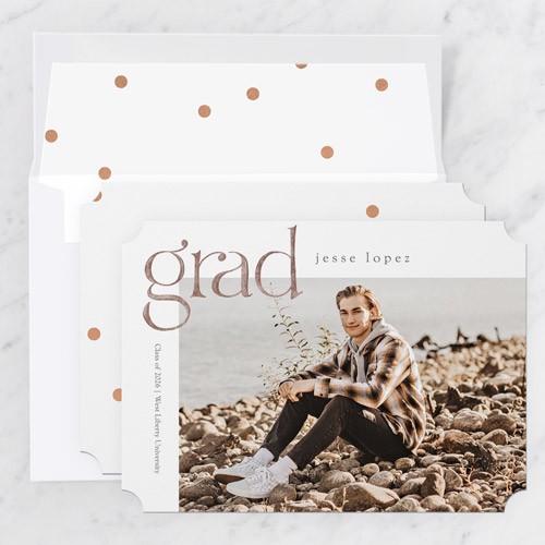 Celebrate the new graduate with this unique graduation announcement. Personalize with the graduate's name and the event details.