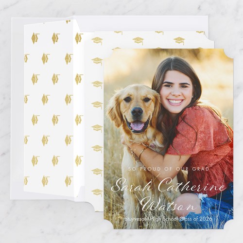 Celebrate the new graduate with this unique graduation announcement. Personalize with the graduate's name and the event details.