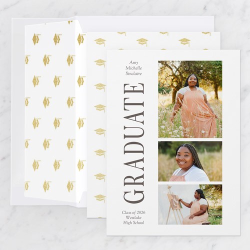 Celebrate the new graduate with this unique graduation announcement. Personalize with the graduate's name and the event details.