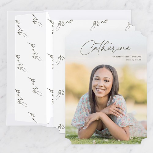 Celebrate the new graduate with this unique graduation announcement. Personalize with the graduate's name and the event details.