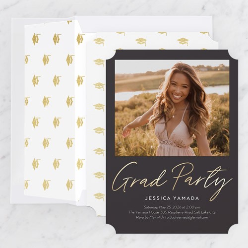 Invite guests to your celebration with a customized graduation invitation. Personalize with event details and custom colors. Add 1-4 photos on the front and up to 16 photos on the back for a personalized, memorable touch. Perfect for celebrating this milestone in style!