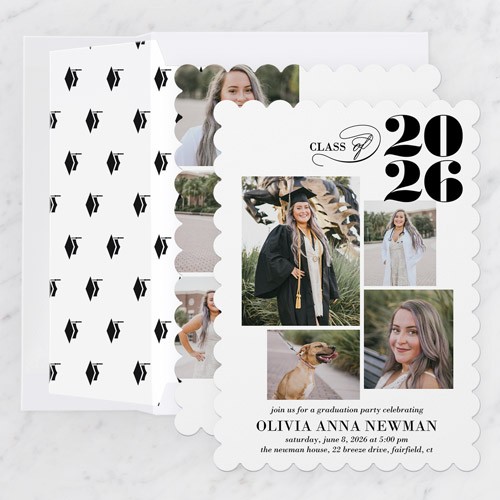 Invite guests to your celebration with a stylish graduation invitation. Personalize with event details, foil options, and custom colors. Add 1-4 photos on the front and 1-3 photos on the back for a personalized touch. Perfect for making your milestone memorable!