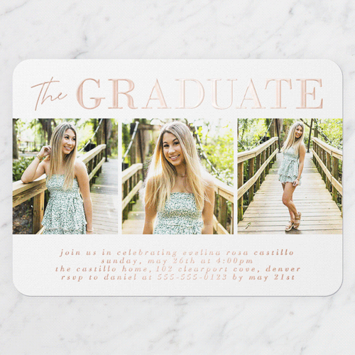 Invite guests to your celebration with a stylish graduation invitation. Personalize with event details, foil accents, and custom colors. Add 1-3 photos on the front and up to 15 photos on the back for a unique touch. Perfectly designed in landscape card orientation to highlight your milestone!