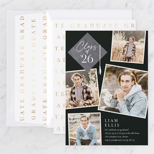 Invite guests to your celebration with a personalized graduation invitation. Customize with event details and choose foil options for an elegant touch. Add 1-4 photos on the front and up to 16 photos on the back for a truly memorable keepsake. Perfect for celebrating your big achievement in style!