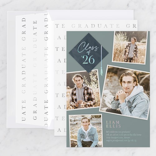 Invite guests to your celebration with a personalized graduation invitation. Customize with event details and choose foil options for an elegant touch. Add 1-4 photos on the front and up to 16 photos on the back for a truly memorable keepsake. Perfect for celebrating your big achievement in style!