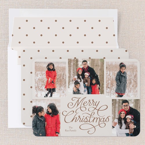 Share all your favorite moments with this classic and minimalist holiday card. The design features a photo collage layout, perfect for families who want to showcase multiple photos to let everyone’s personality shine. Choose from the elegant “Merry Christmas” or “Happy Holidays” greeting against a crisp white and warm brown background, or click the color wheel icon to choose your own to coordinate the background with your photos. This 6x8 Christmas card gives you plenty of space for your memories. Personalize with your family name and add more photos or a heartfelt message on the back for free. Send a simple holiday card that feels personal, warm, and truly yours this season.