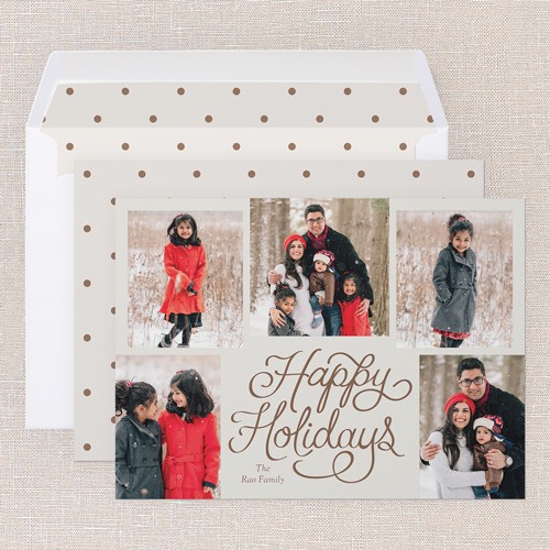 Share all your favorite moments with this classic and minimalist holiday card. The design features a photo collage layout, perfect for families who want to showcase multiple photos to let everyone’s personality shine. Choose from the elegant “Merry Christmas” or “Happy Holidays” greeting against a crisp white and warm brown background, or click the color wheel icon to choose your own to coordinate the background with your photos. This 6x8 Christmas card gives you plenty of space for your memories. Personalize with your family name and add more photos or a heartfelt message on the back for free. Send a simple holiday card that feels personal, warm, and truly yours this season.