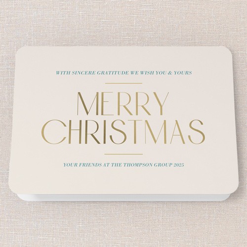 Send a holiday card that’s classic and professional with this non-photo business Christmas card. This elegant design features a clean beige background and sophisticated gold lettering, perfect for sharing season’s greetings with clients, colleagues, and employees. As a business holiday card, it’s a thoughtful way to express gratitude and keep your company top of mind. You can personalize the greeting to say “Happy Holidays” or “Merry Christmas,” and click the color wheel icon to choose your own background color—great for coordinating with your brand. Sized at 5x7, this corporate Christmas card is just right for mailing or hand-delivering. Make your holiday message memorable and meaningful with a card that’s warm, genuine, and perfectly polished for business.