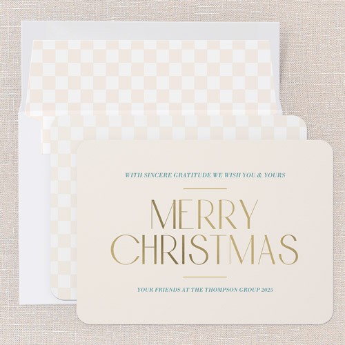 Send a holiday card that’s classic and professional with this non-photo business Christmas card. This elegant design features a clean beige background and sophisticated gold lettering, perfect for sharing season’s greetings with clients, colleagues, and employees. As a business holiday card, it’s a thoughtful way to express gratitude and keep your company top of mind. You can personalize the greeting to say “Happy Holidays” or “Merry Christmas,” and click the color wheel icon to choose your own background color—great for coordinating with your brand. Sized at 5x7, this corporate Christmas card is just right for mailing or hand-delivering. Make your holiday message memorable and meaningful with a card that’s warm, genuine, and perfectly polished for business.