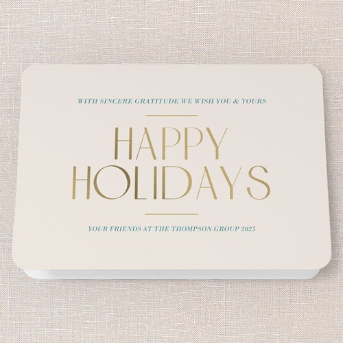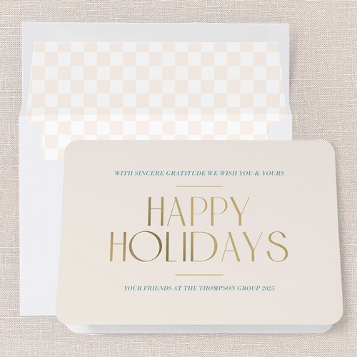 Send a holiday card that’s classic and professional with this non-photo business Christmas card. This elegant design features a clean beige background and sophisticated gold lettering, perfect for sharing season’s greetings with clients, colleagues, and employees. As a business holiday card, it’s a thoughtful way to express gratitude and keep your company top of mind. You can personalize the greeting to say “Happy Holidays” or “Merry Christmas,” and click the color wheel icon to choose your own background color—great for coordinating with your brand. Sized at 5x7, this corporate Christmas card is just right for mailing or hand-delivering. Make your holiday message memorable and meaningful with a card that’s warm, genuine, and perfectly polished for business.