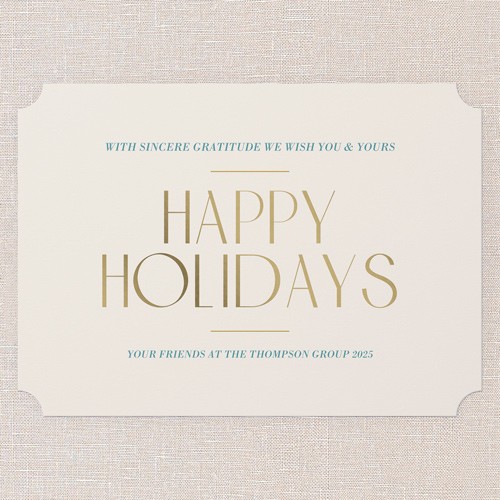 Send a holiday card that’s classic and professional with this non-photo business Christmas card. This elegant design features a clean beige background and sophisticated gold lettering, perfect for sharing season’s greetings with clients, colleagues, and employees. As a business holiday card, it’s a thoughtful way to express gratitude and keep your company top of mind. You can personalize the greeting to say “Happy Holidays” or “Merry Christmas,” and click the color wheel icon to choose your own background color—great for coordinating with your brand. Sized at 5x7, this corporate Christmas card is just right for mailing or hand-delivering. Make your holiday message memorable and meaningful with a card that’s warm, genuine, and perfectly polished for business.