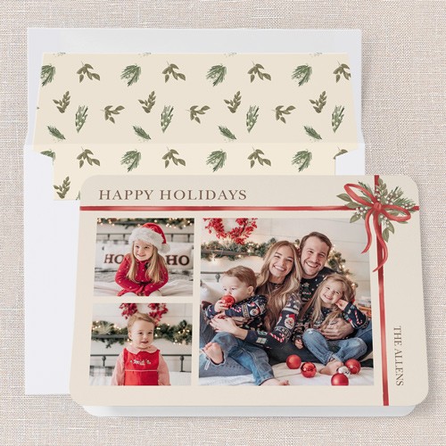 Showcase your beautiful memories with this elegant 3-photo Christmas card, featuring classic holiday floral, botanical and ribbon elements. Add a personal touch with your names and a heartfelt message on the back, or include additional photos to make your greeting even more special. This classic bow Christmas card beautifully ties together your festive cheer and cherished moments.